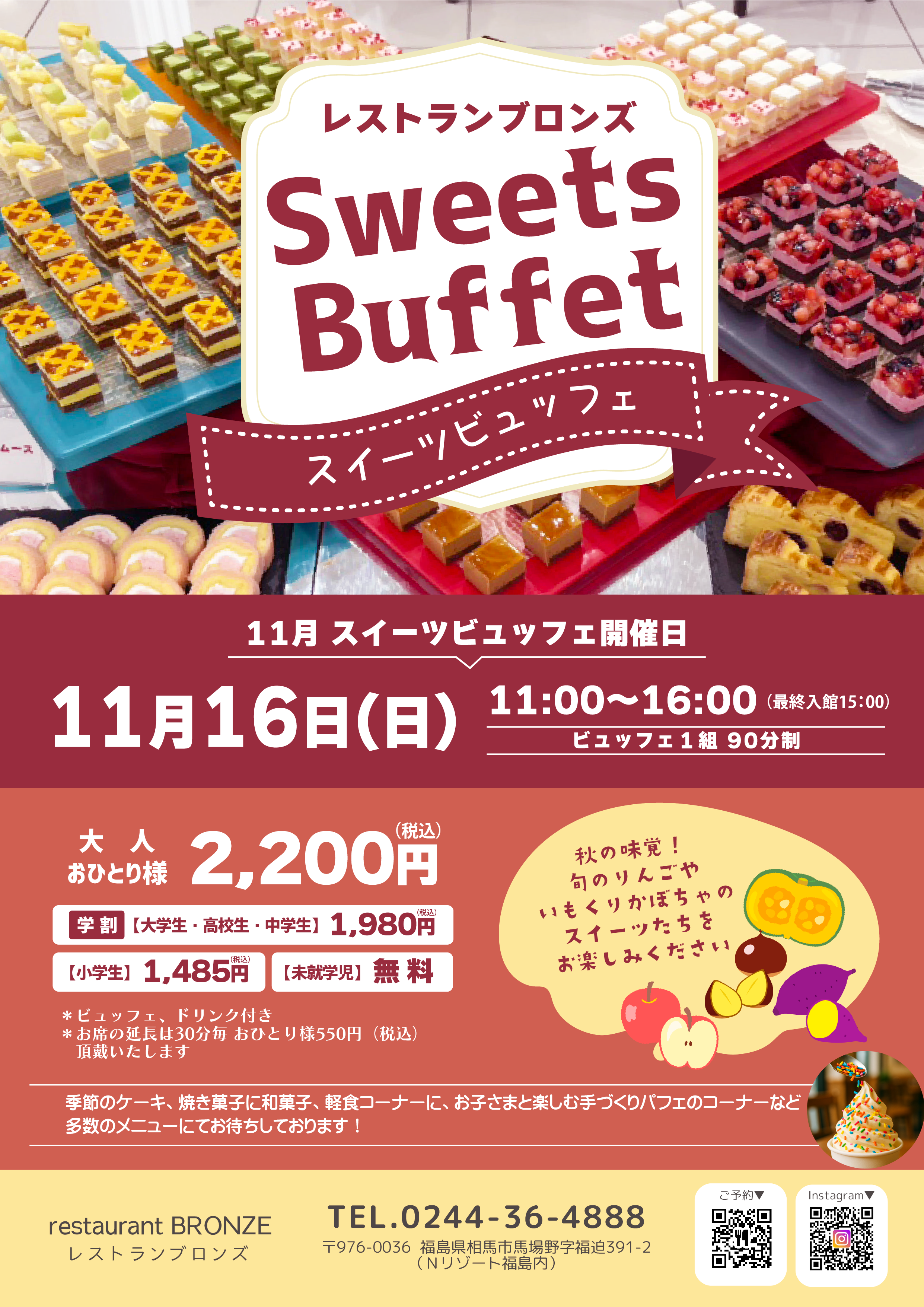 今回は当館のレストランブロンズにて毎月開催しております、スイーツビュッフェのご案内です(^^♪