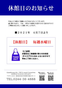 平素よりN-resortFukushima、レストランBRONZEをご利用頂き、 誠にありがとうございます。 誠に勝手ながら、下記、日程より休館日を設けさせていただきますので ご理解のほど宜しくお願い申し上げます。 &…