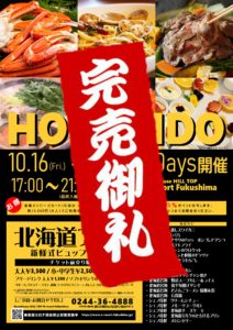 平素よりN-resortFukushima、レストランBRONZEをご利用頂き、誠にありがとうございます。 10月16日・17日北海道フェア開催に伴い レストランBRONZE・テイクアウト&デリバリーの営業…